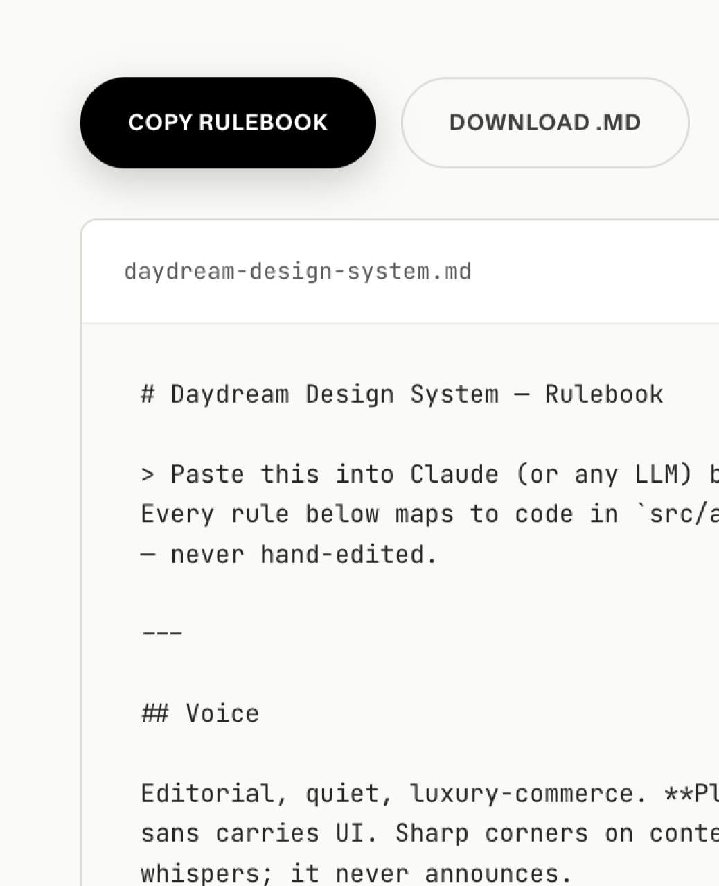 None of the above exists without the system underneath it. I rebuilt our entire visual language this week — tokens, components, typography, motion. A warm editorial palette. Two licensed typefaces (a serif for editorial moments, a workhorse sans). A component library built on shadcn but retuned for our voice. Opacity-based layered borders for a hairline editorial feel. Theme tokens that adapt light-to-dark cleanly without breaking contrast.